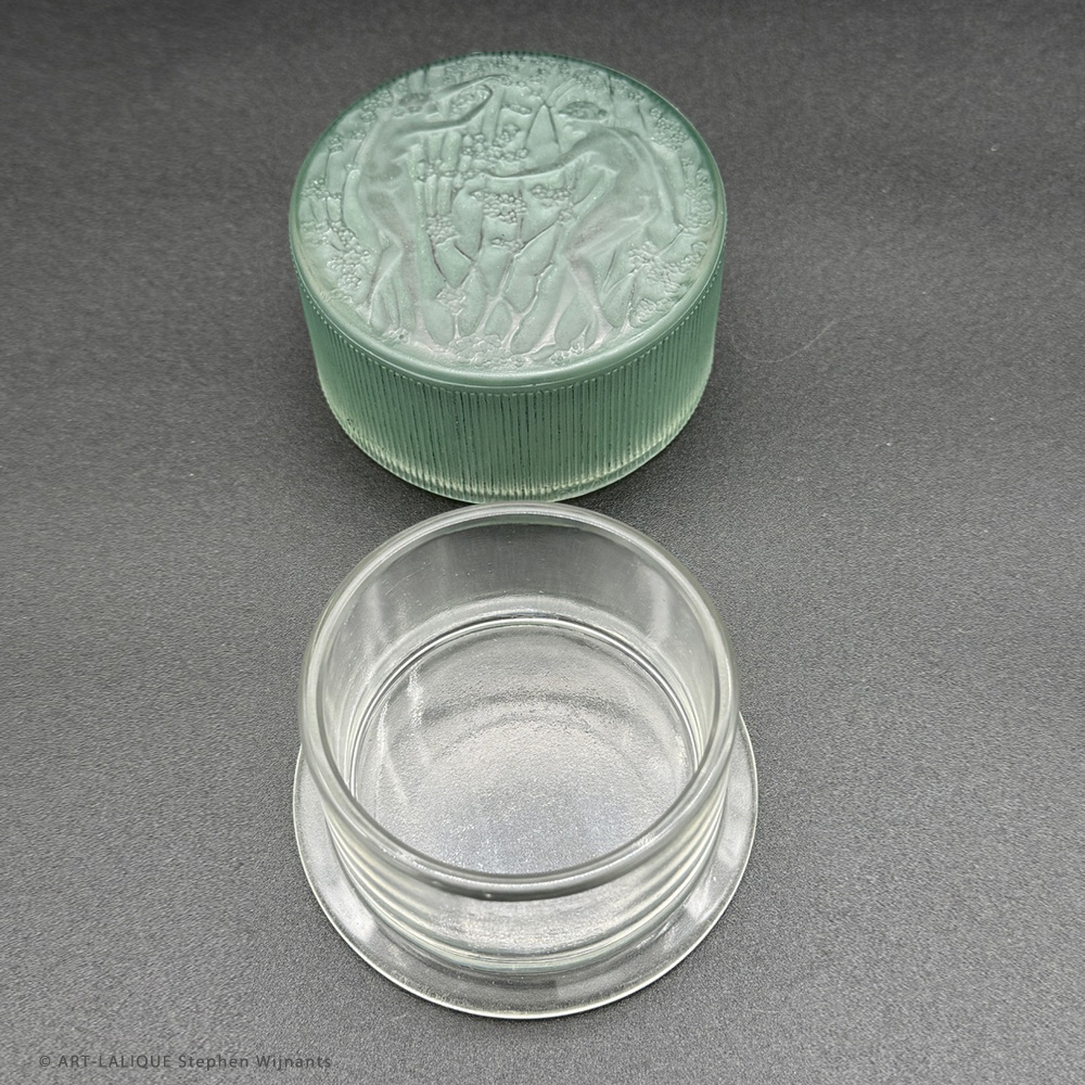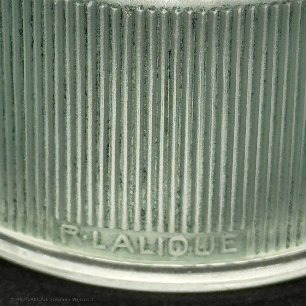 Clear glass - Green patina. Reference: Félix Marcilhac, catalogue raisonné de l'oeuvre de verre de R.Lalique, éd. de l'Amateur Paris, 1994, N°32